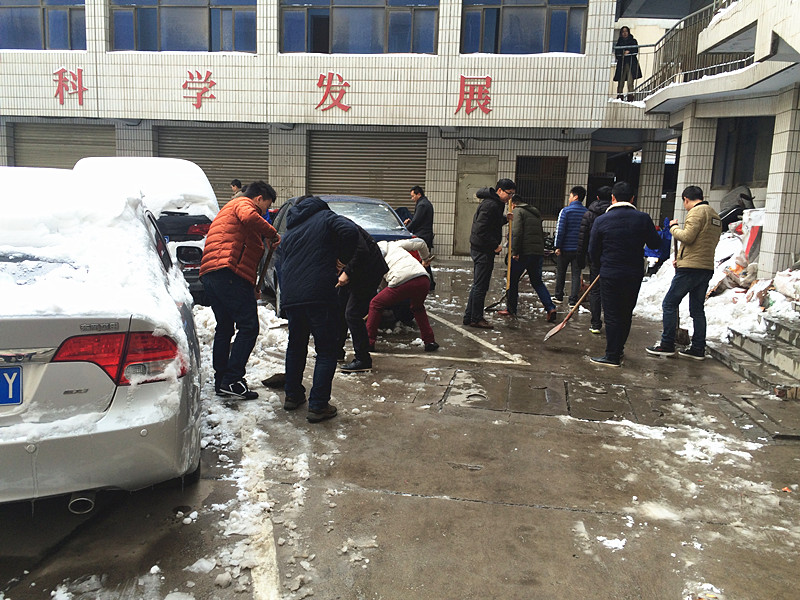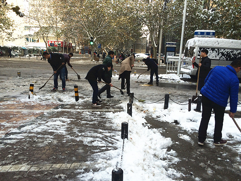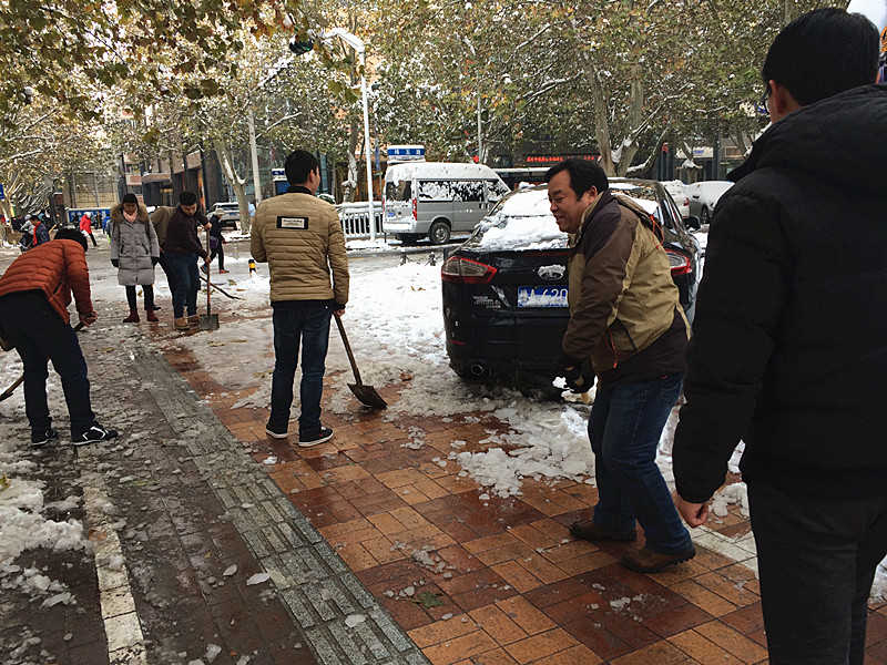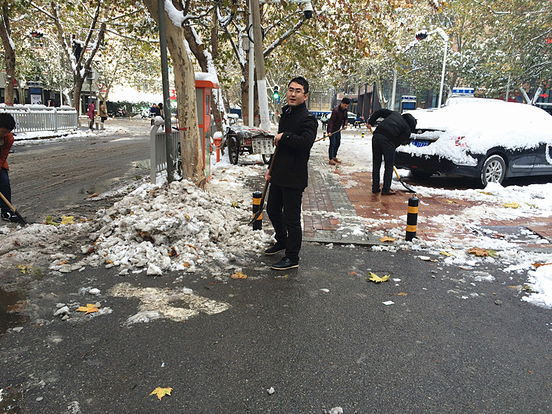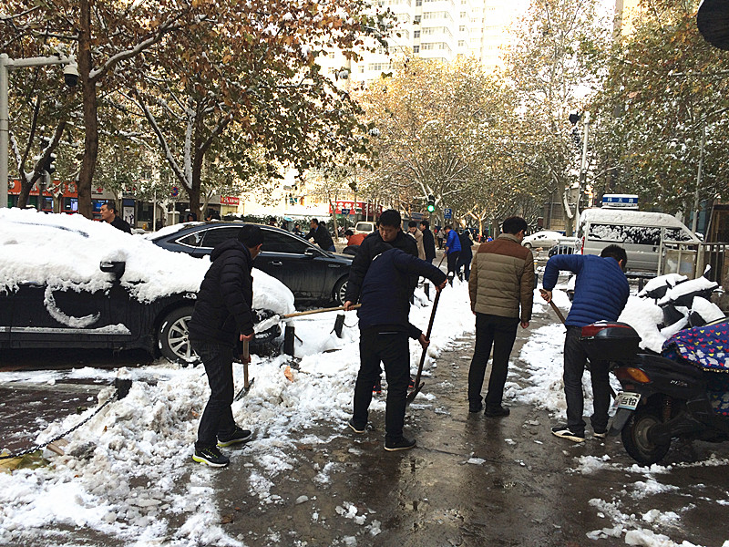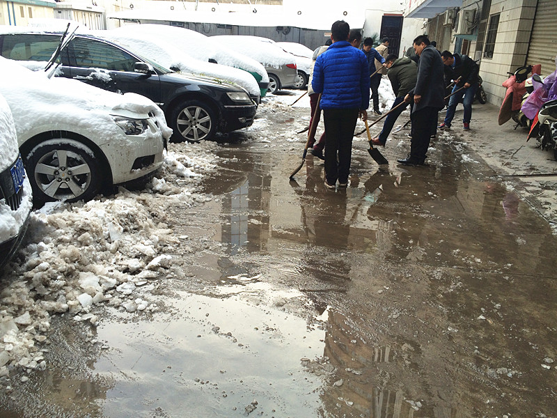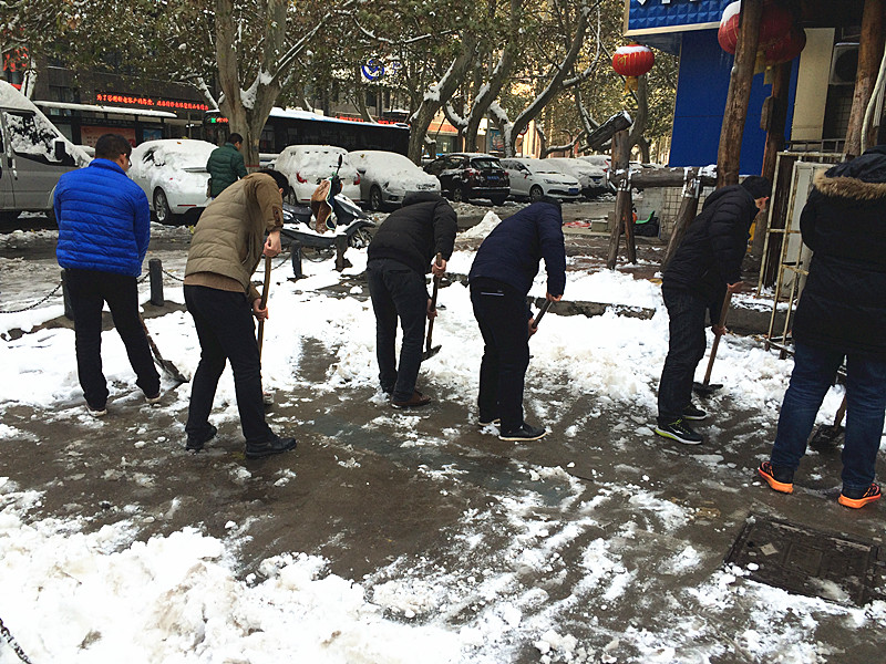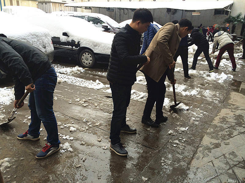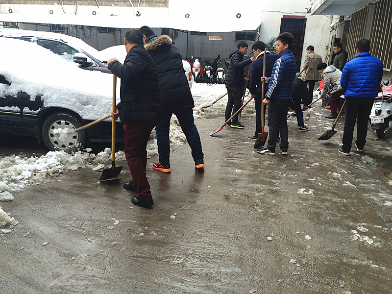 “各人自掃門前雪”此時(shí)發(fā)現(xiàn)這句俗語并不是字面意思了。在溫度只有零下的室外,一群可愛的人奮力的揮舞著鐵鍬,大家伙有說有笑,朝氣,活力,很快清掃出一片干凈的空地,使整個(gè)過道清爽了不少。